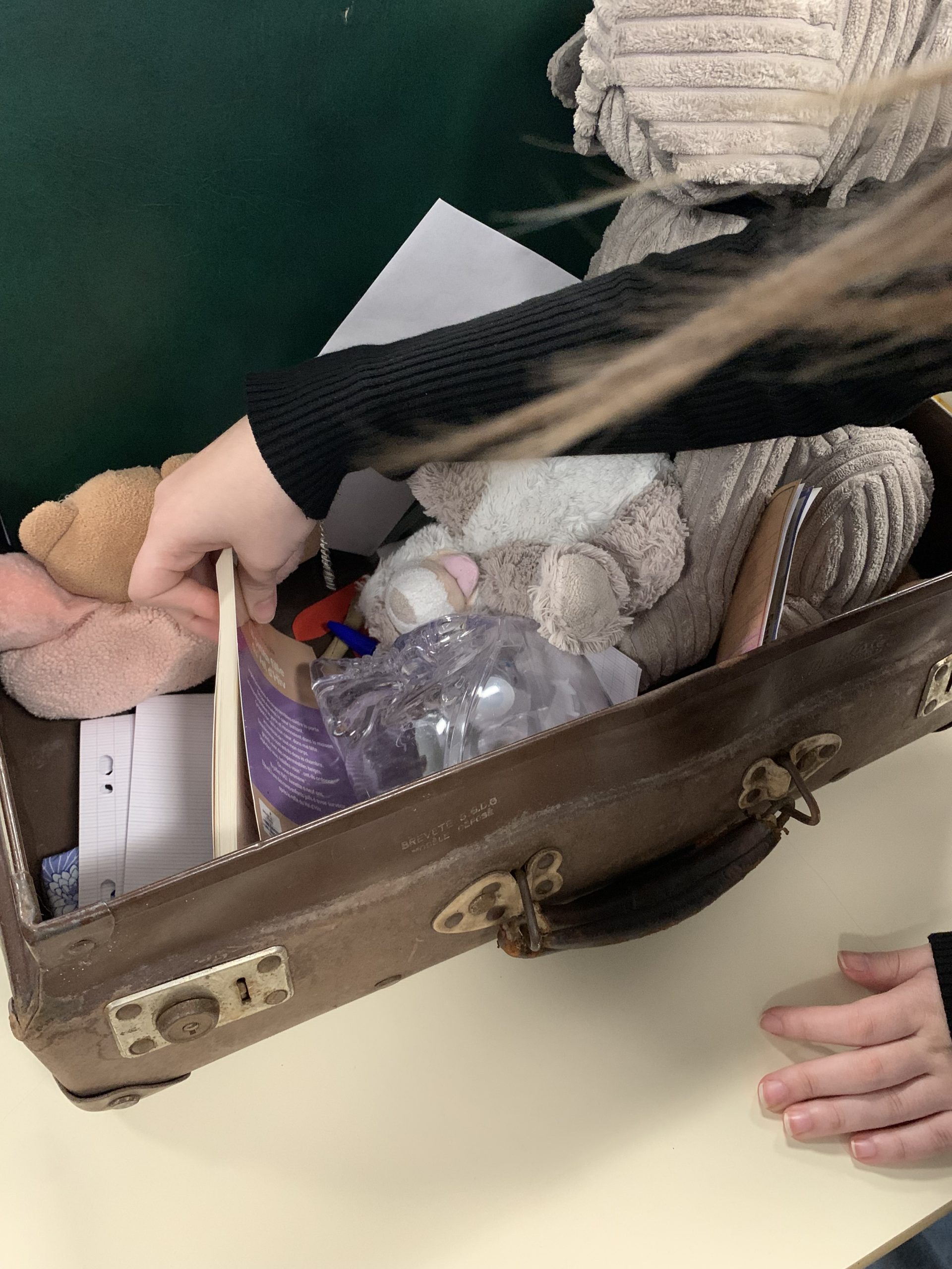 Au fil de notre séquence de lecture autour du roman Un secret de Philippe Grimbert, cette valise a pris tout son sens. Pendant les vacances, chaque élève avait une mission : trouver, fabriquer ou choisir un objet qui, pour lui, représentait le livre ou un élément marquant de l’histoire.