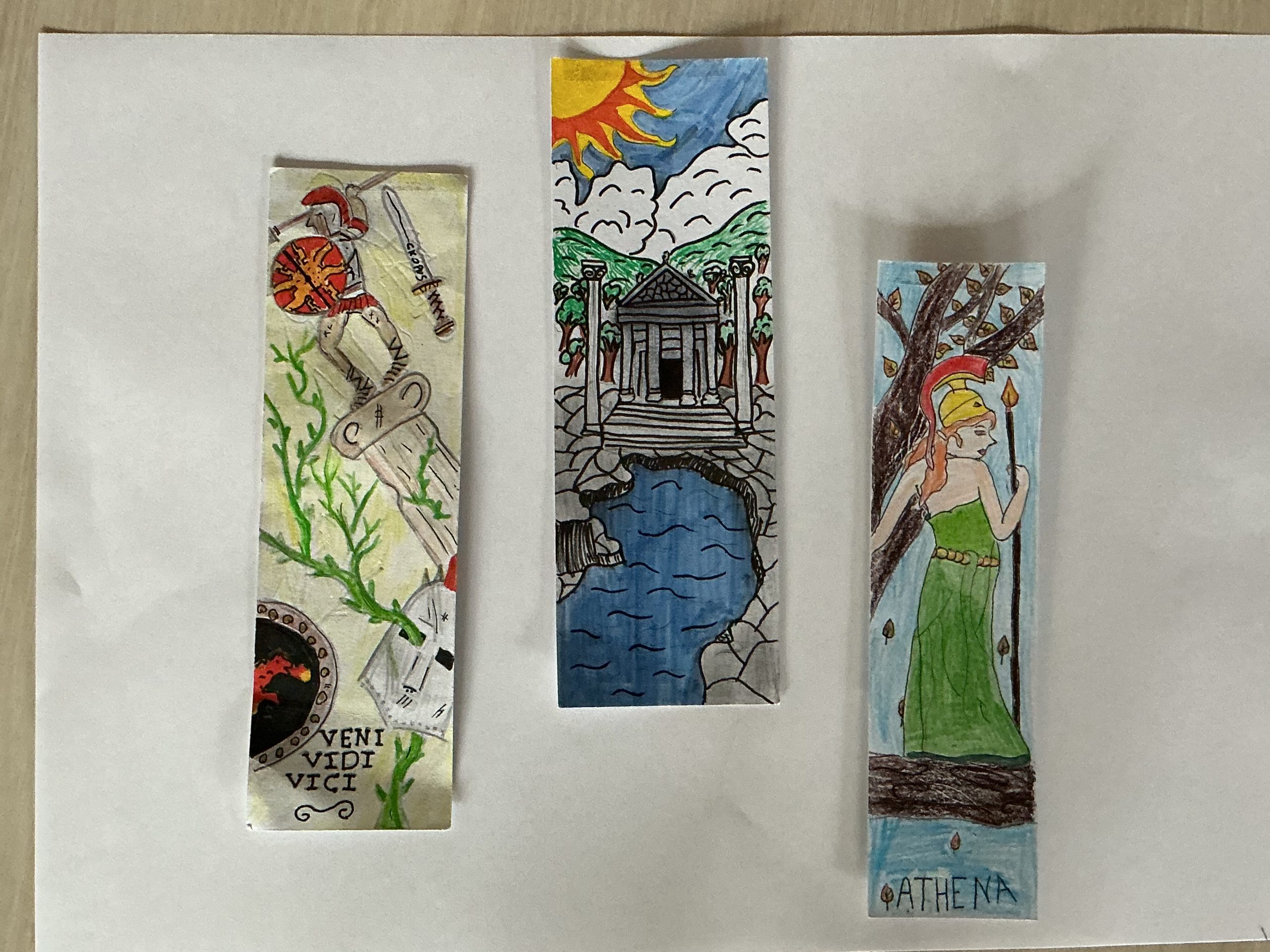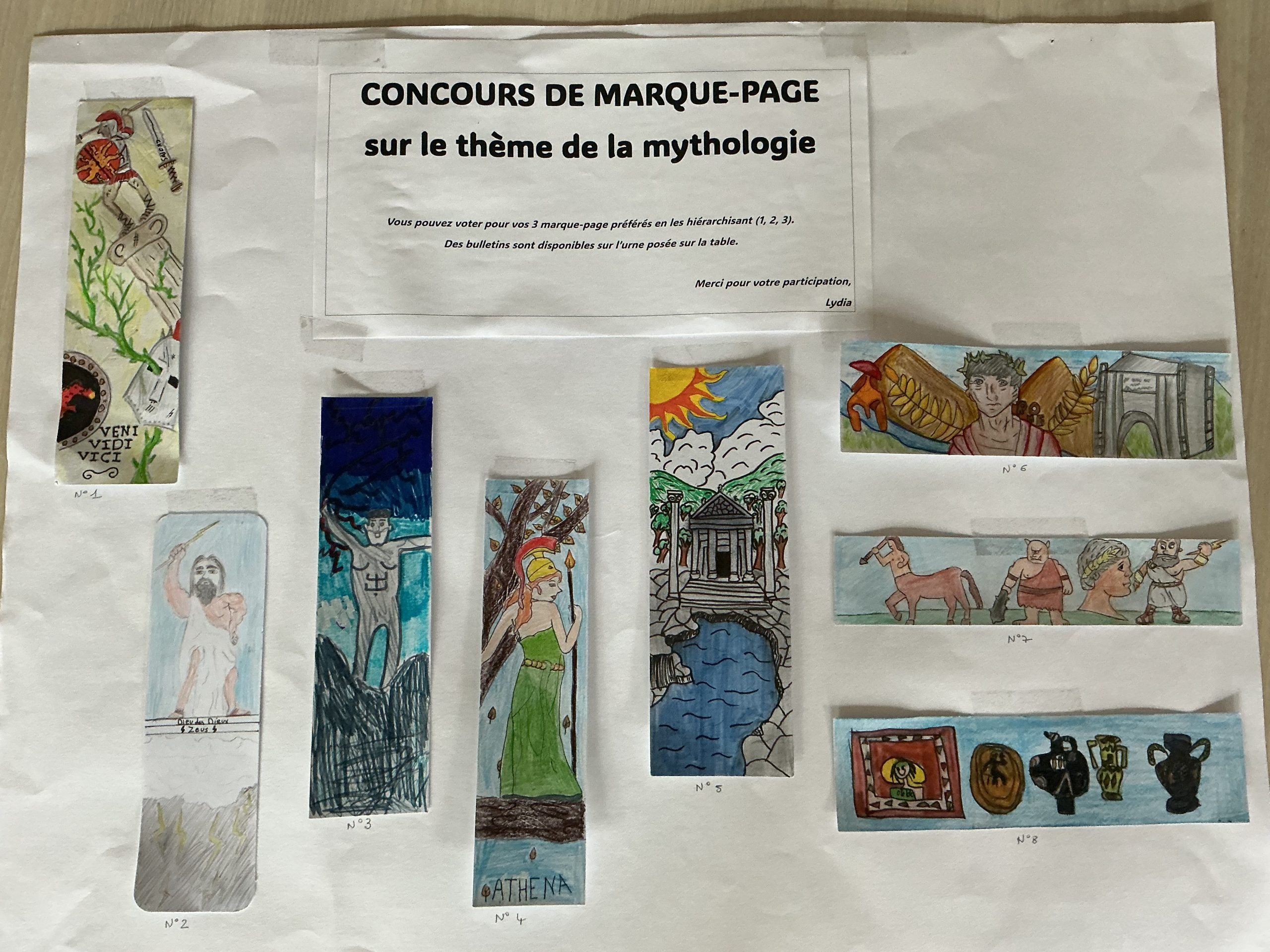 Le thème du traditionnel concours de marque-page était cette année la mythologie gréco-latine. Huit élèves ont participé au concours en imaginant des marque-page autour des personnages et de l’univers de l’Antiquité gréco-latine : les dieux et les déesses, les temples et les vestiges… Tous ont fait preuve de créativité, de soin et d’un bon coup de crayon  !
